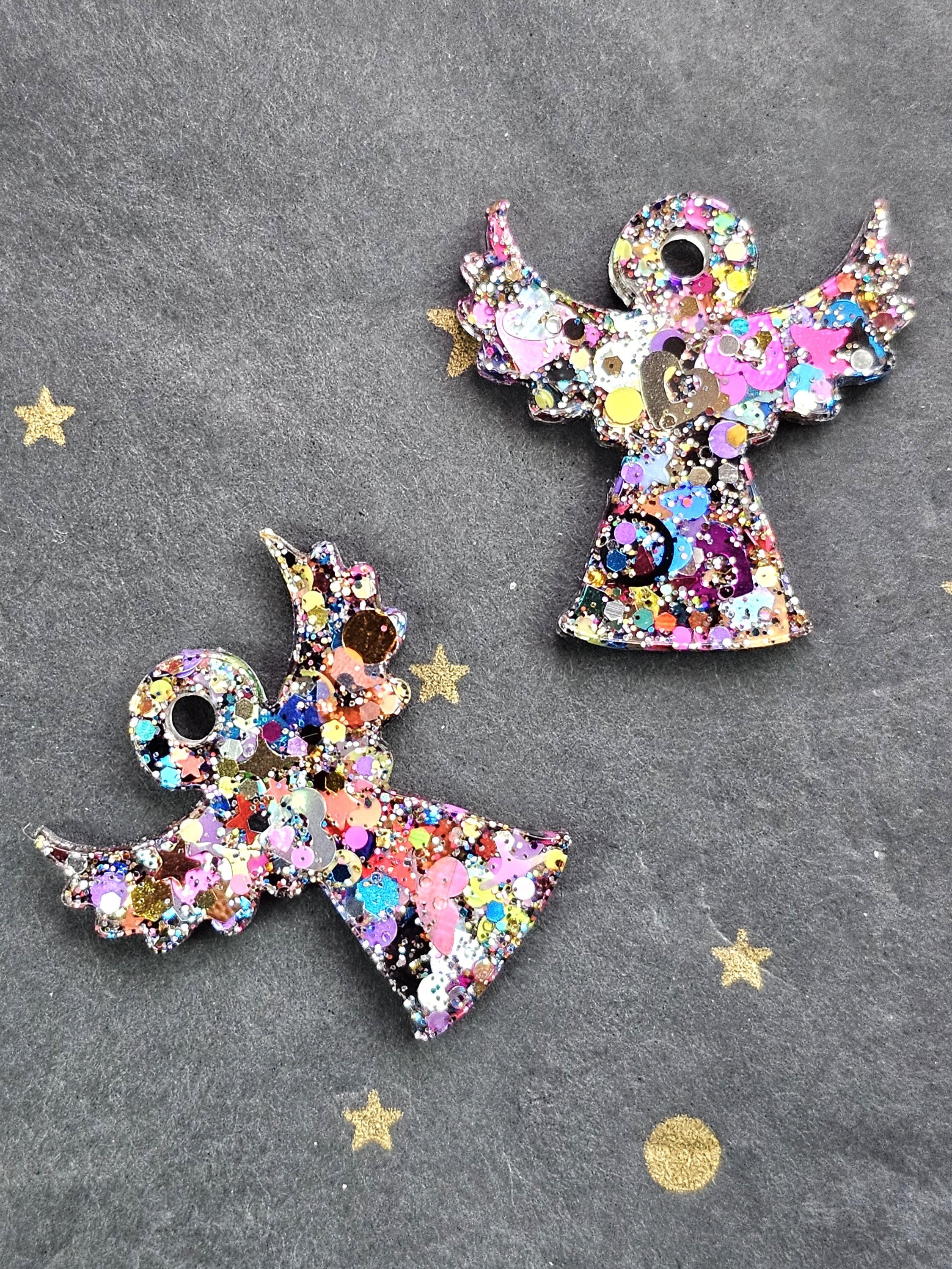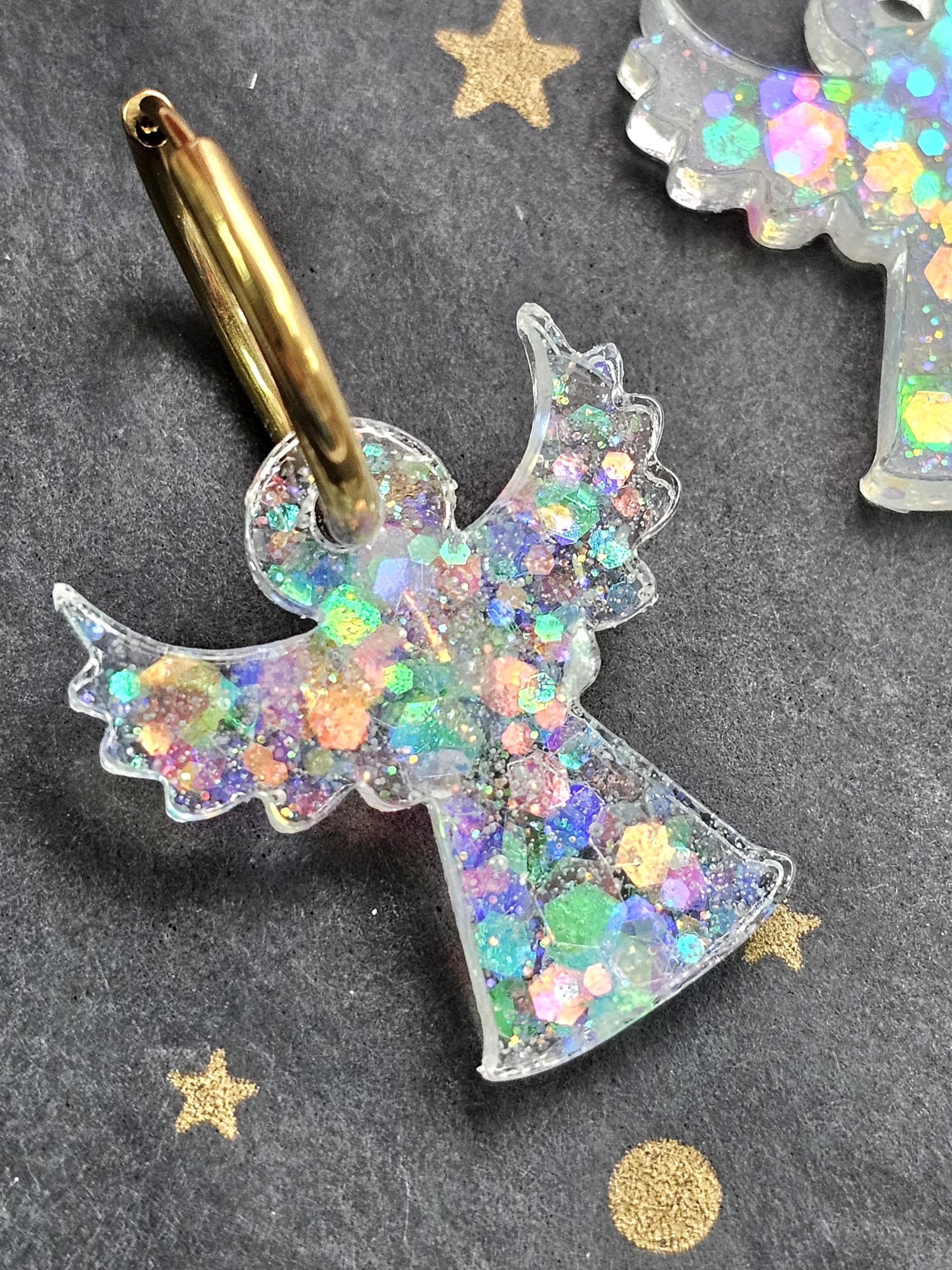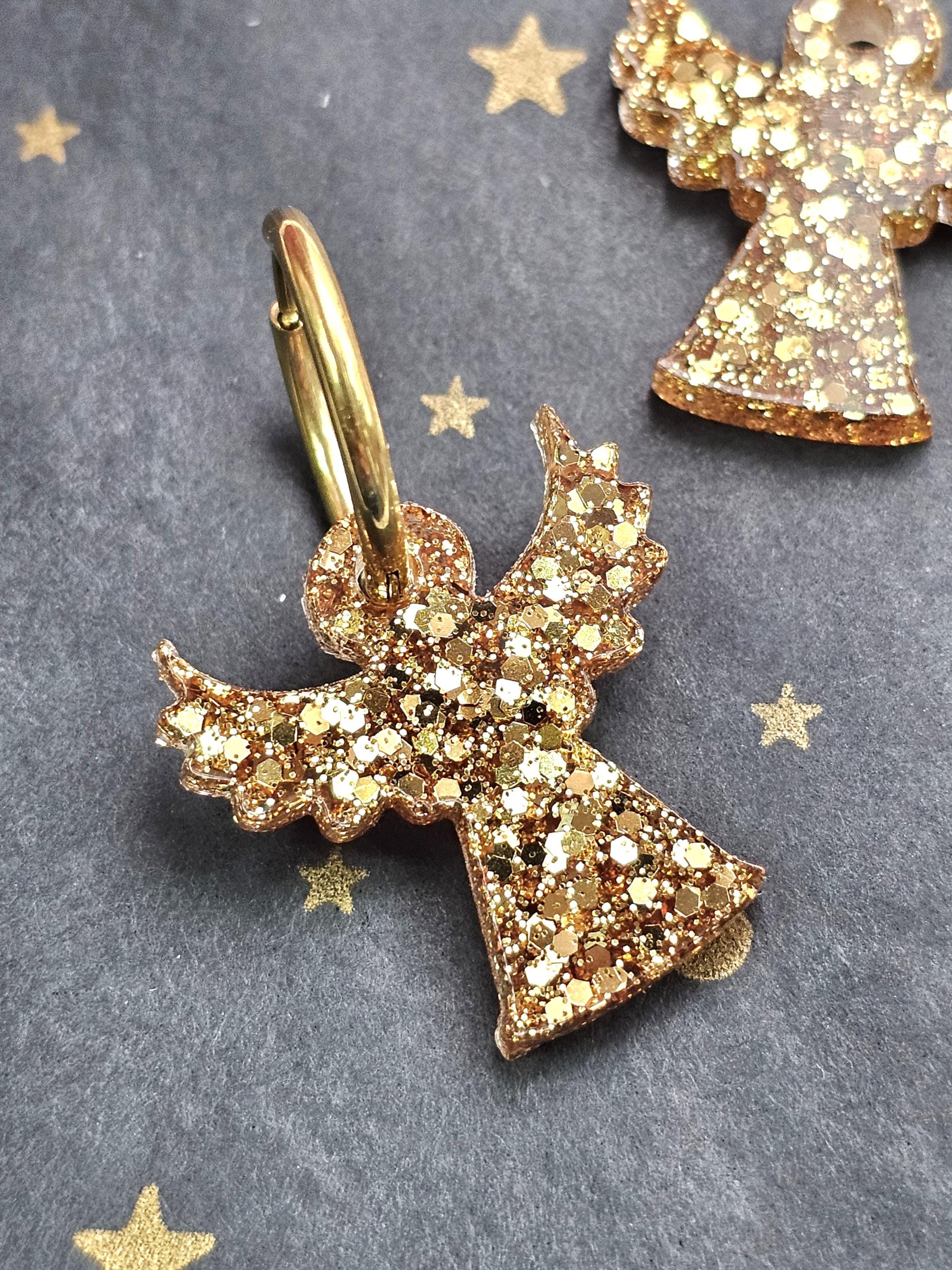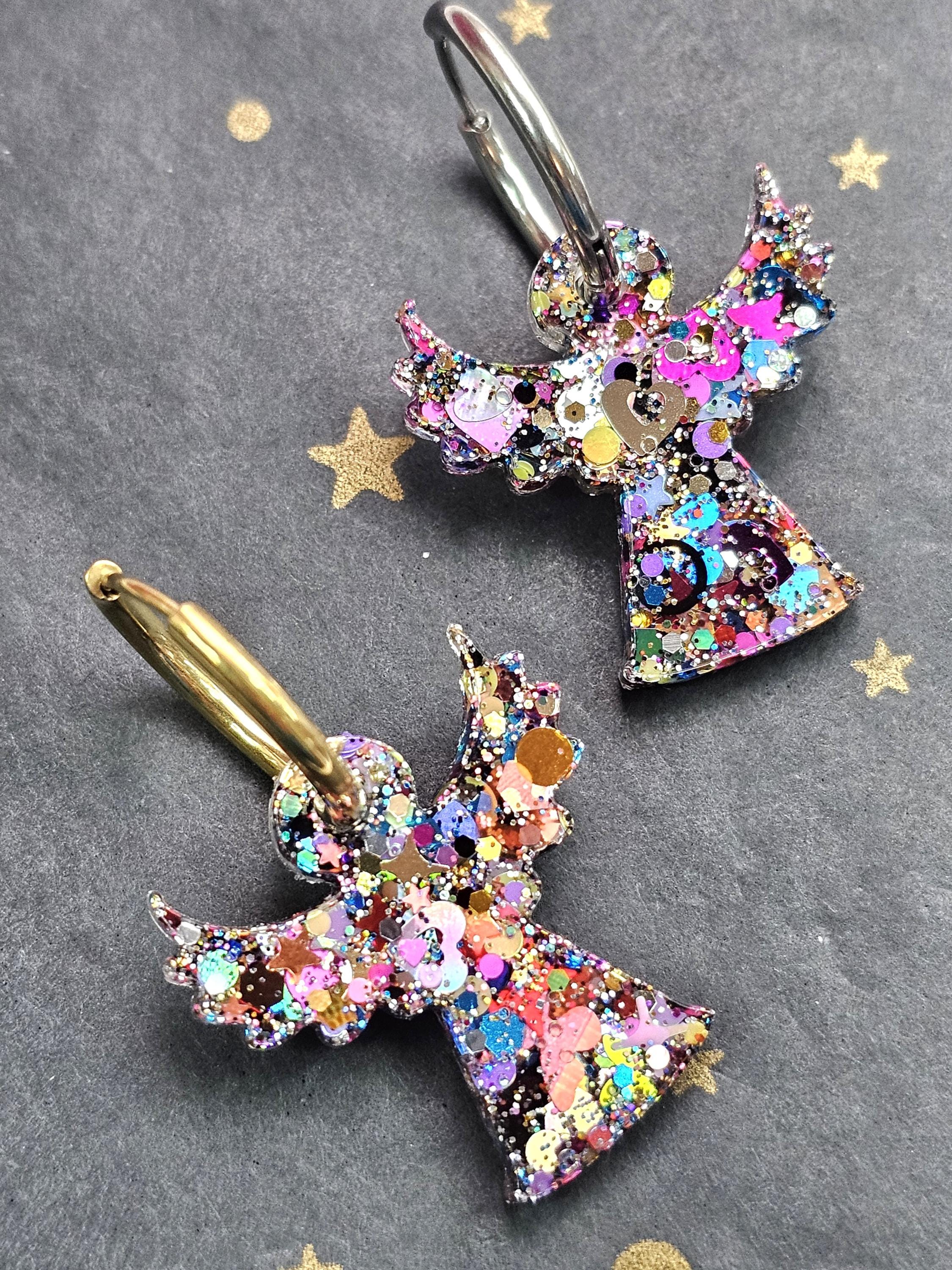 Boucles créoles en acier inoxydable hypoallergénique. Pampille ange gardien en résine & paillettes – Création artisanale Résine-moi Un Chat