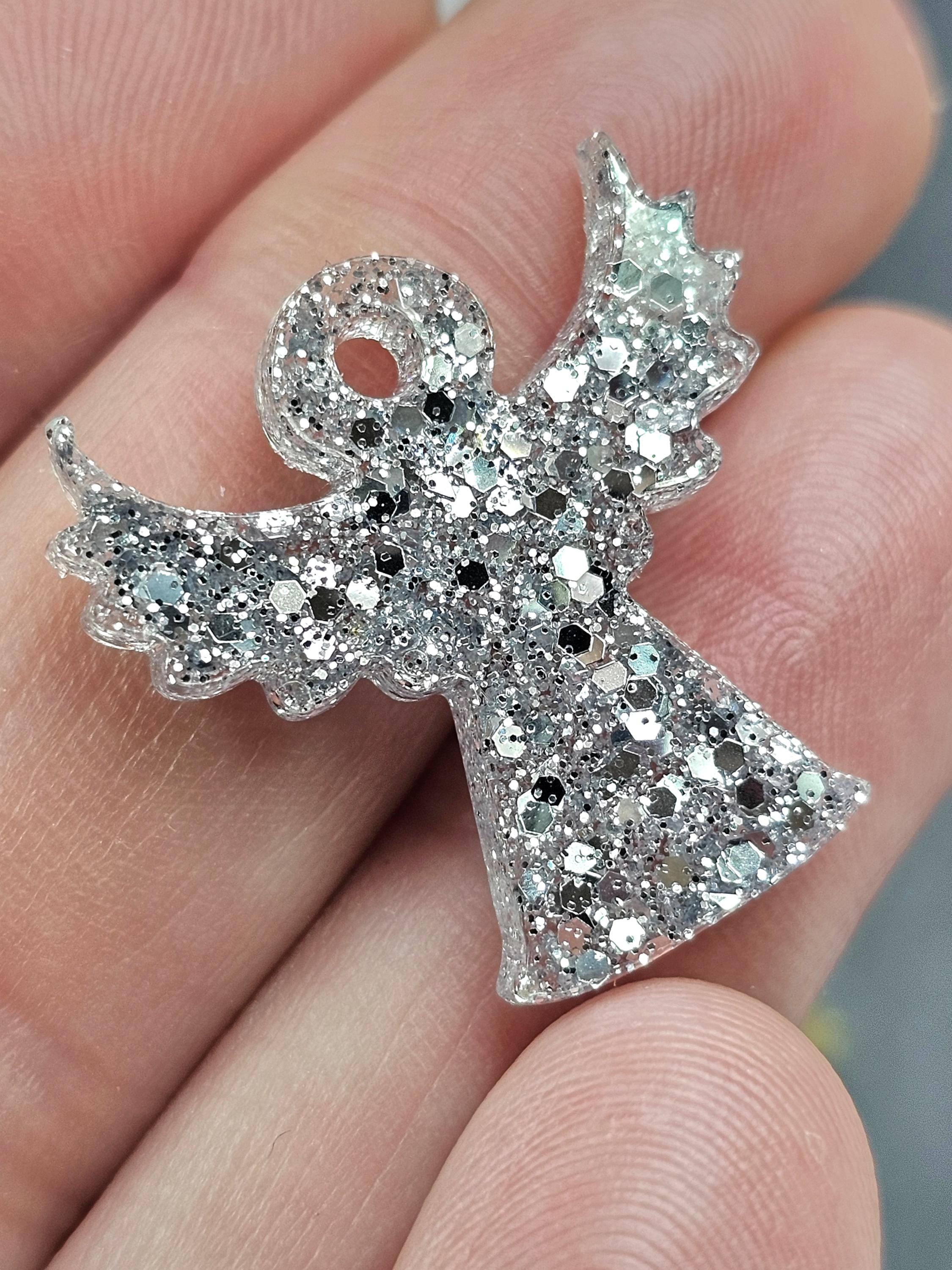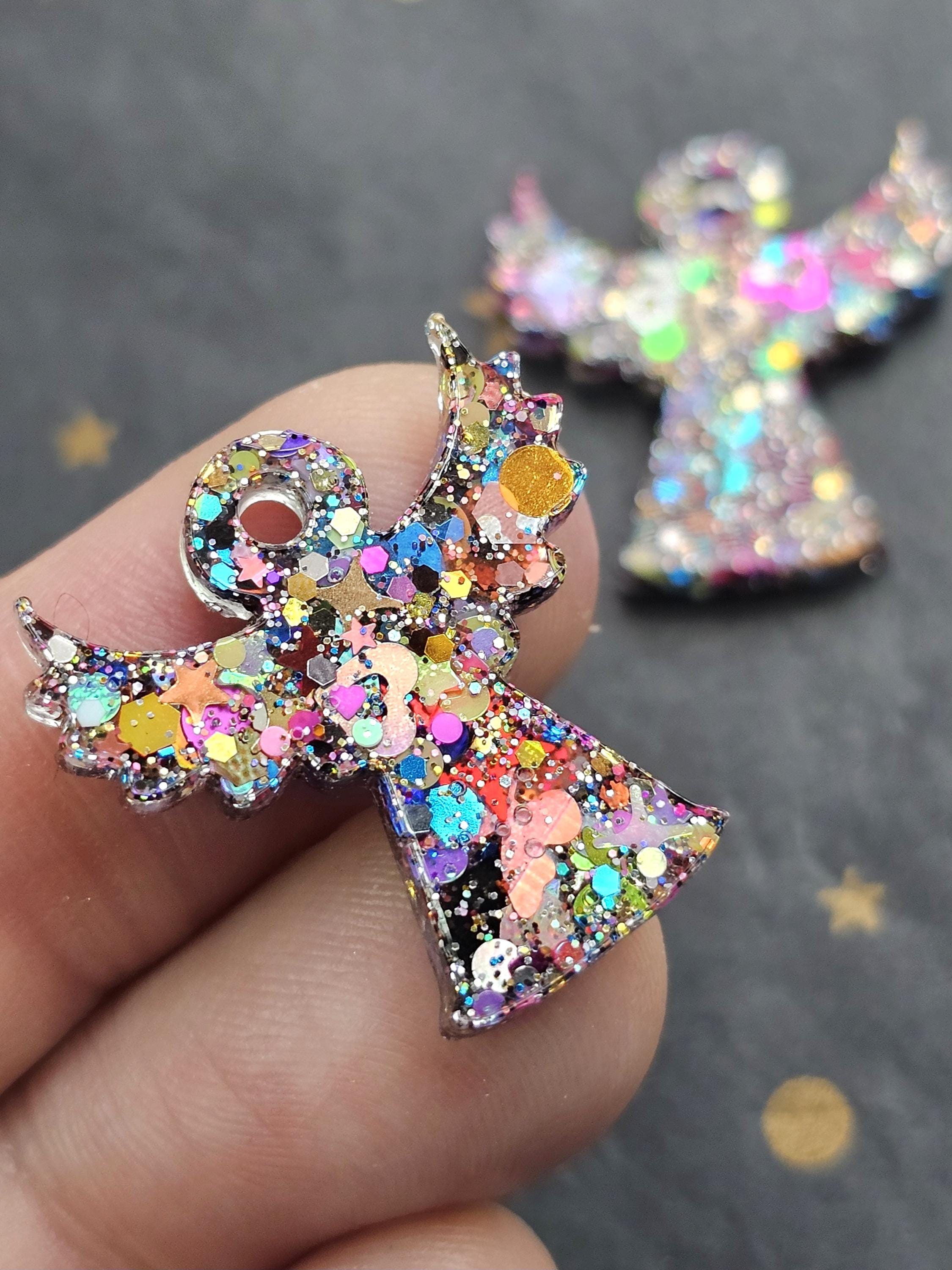 Boucles d’oreille créoles en acier inoxydable hypoallergénique 316. Pampille ange gardien en résine transparente & mélange de paillettes fait maison.